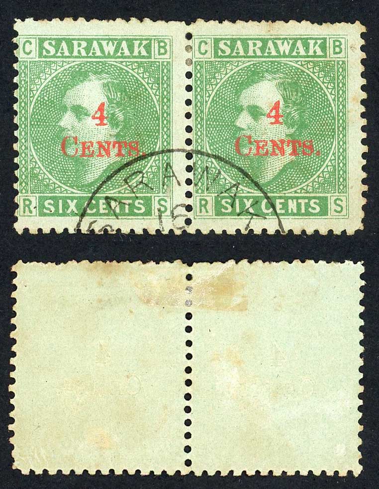 Sarawak SG34 4c on 6c Green CDS used Cat 240 pounds