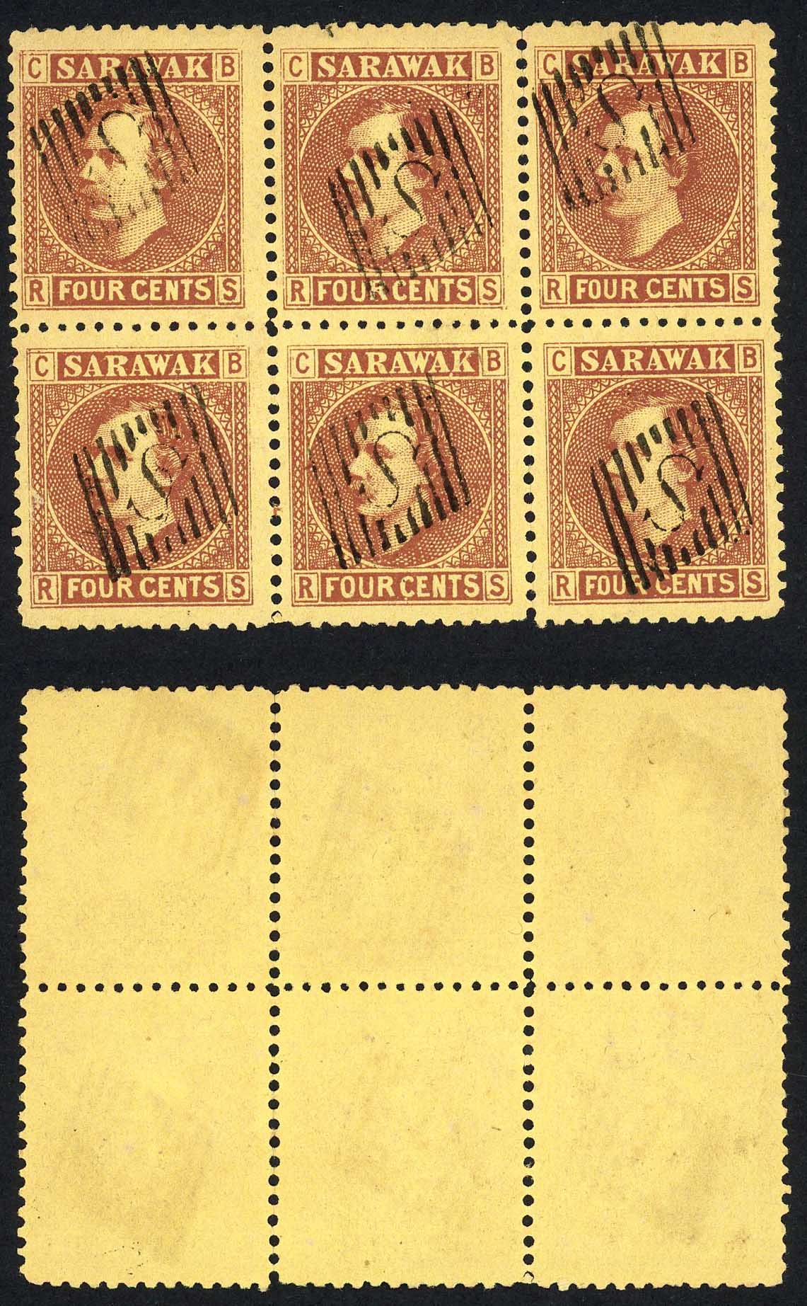 Sarawak SG4 1875 4c red-brown/yellow Fine used block of 6