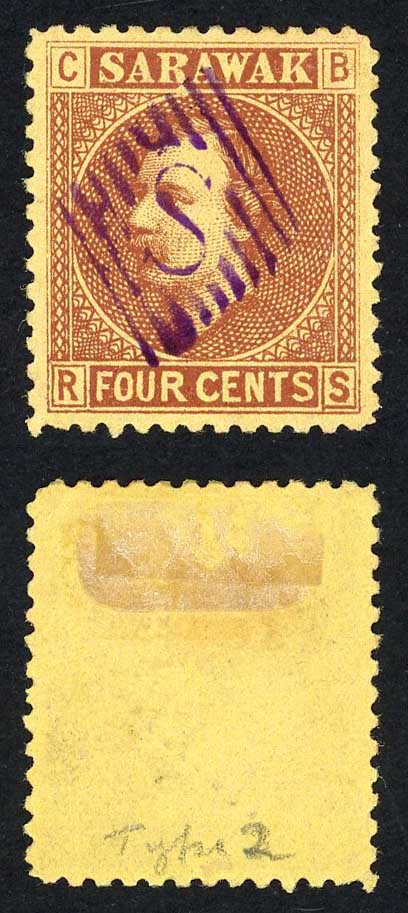 Sarawak SG4 1875 4c red-brown/yellow with S in Diamond cancel in VIOLET