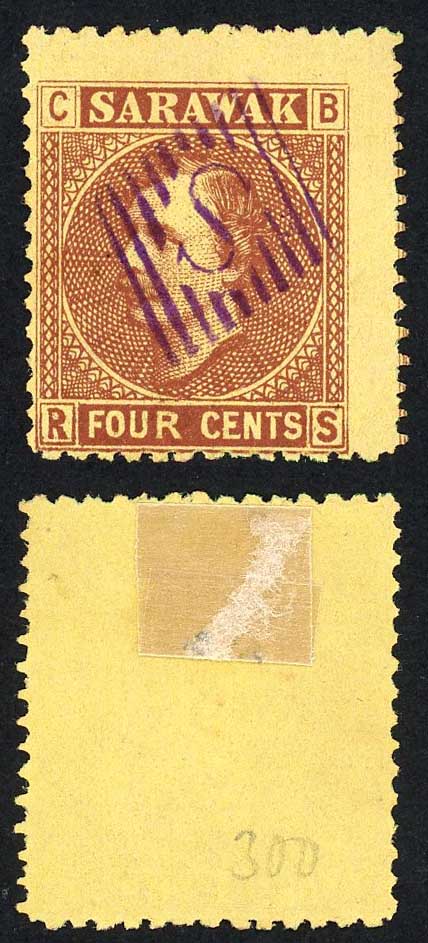 Sarawak SG4 1875 4c red-brown/yellow with S in Diamond cancel in VIOLET