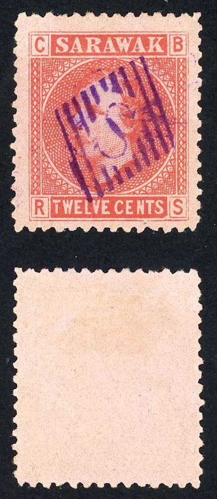 Sarawak SG7 1875 12c Red/pale rose with S in Diamond cancel in VIOLET
