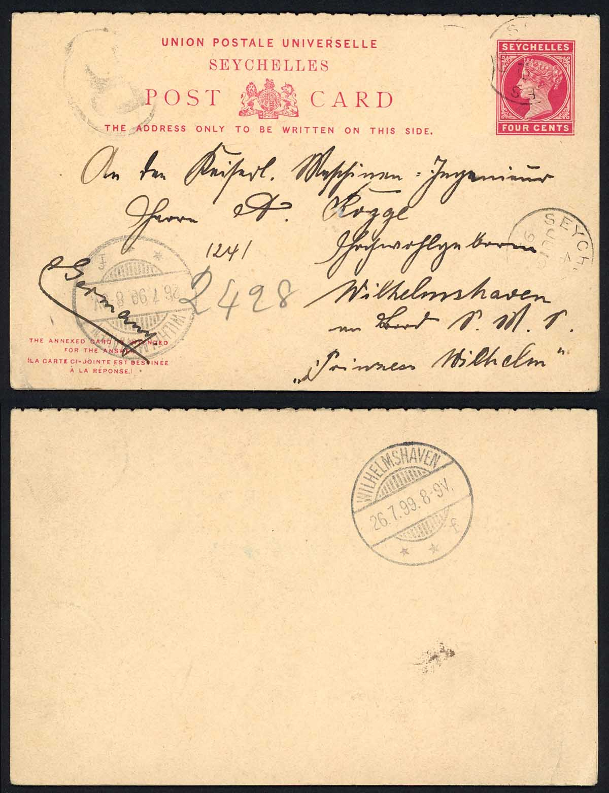 Seychelles HG4 4c Reply Card outward used to Germany Reply Mint RARE