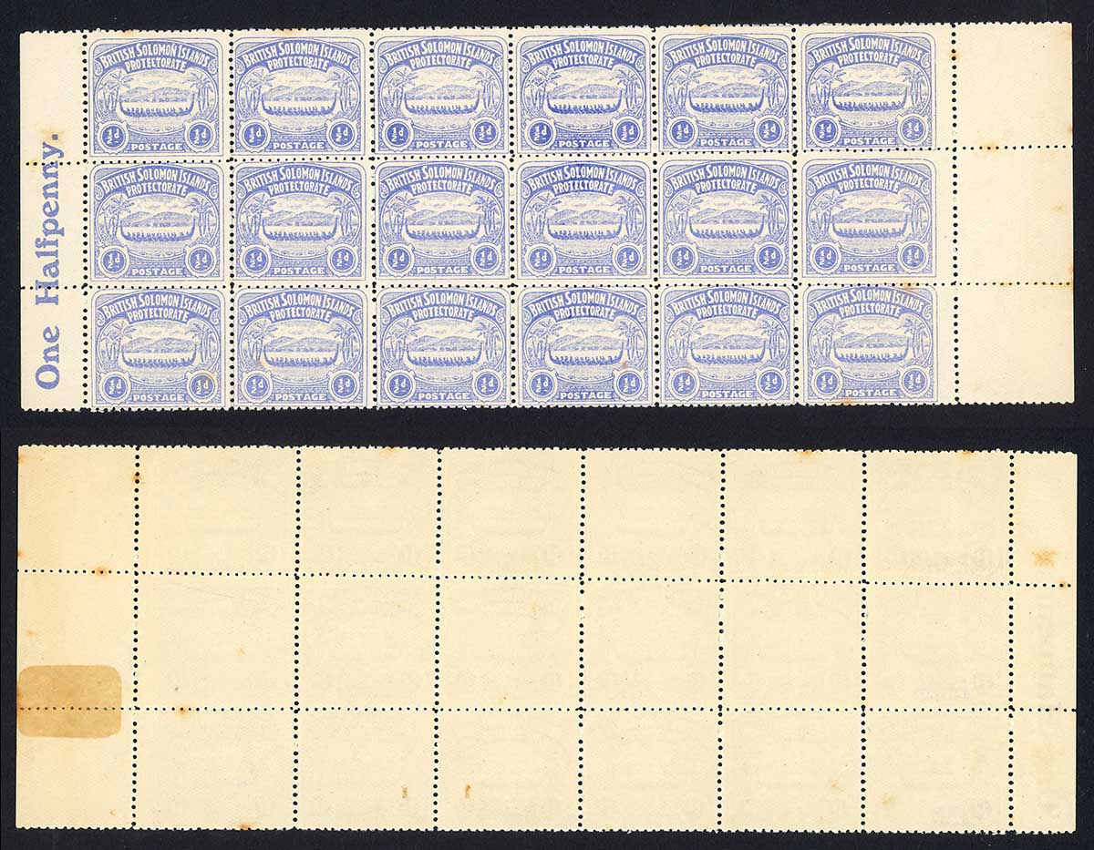 Solomon Is SG1 1/2d Ultramarine Block of 18 Large Canoe U/M Cat 165++ pounds