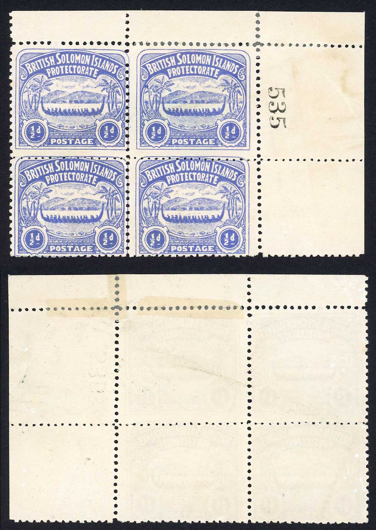 Solomon Is SG1 1/2d Ultramarine Large Canoe Corner block No Gum Cat 44 pounds