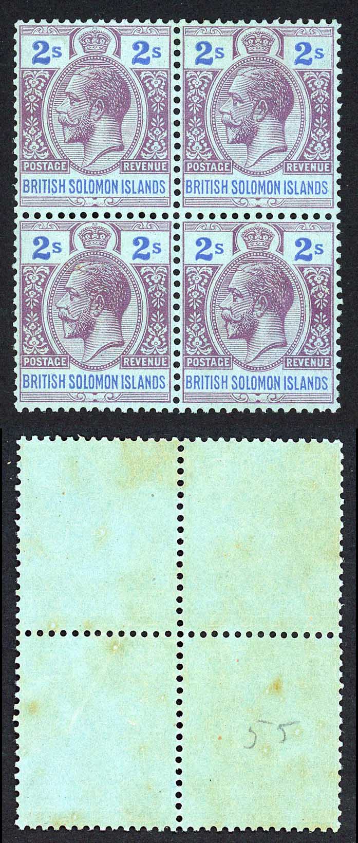 Solomon Is SG49 2/- Wmk Script Block 2 x U/M (toned) Cat 128 pounds