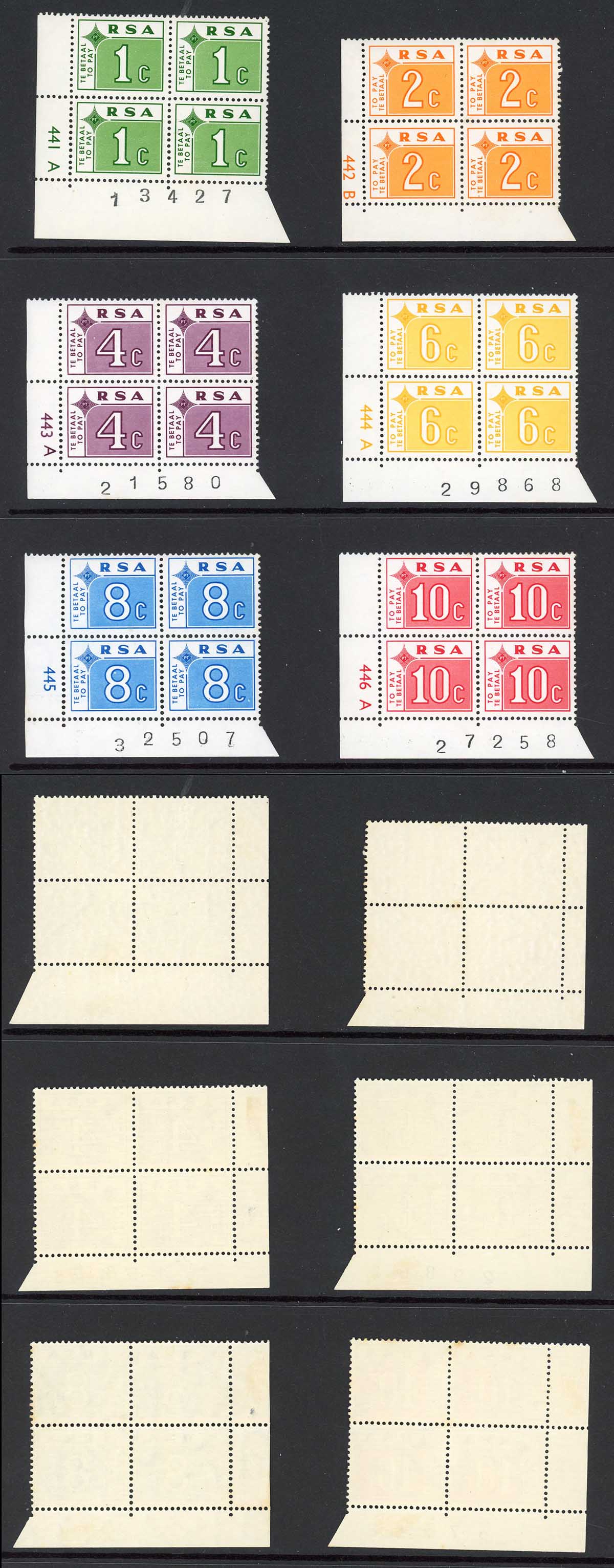 South Africa SGD75/D80 Post due set of 6 U/M Plate Blocks Cat 50.80 pounds