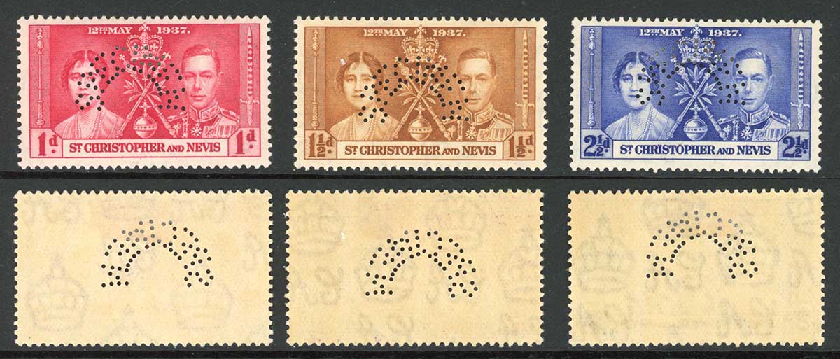 St Kitts Nevis SG65s/7s Coronation Set PERF SPECIMEN M/M Cat 90 pounds