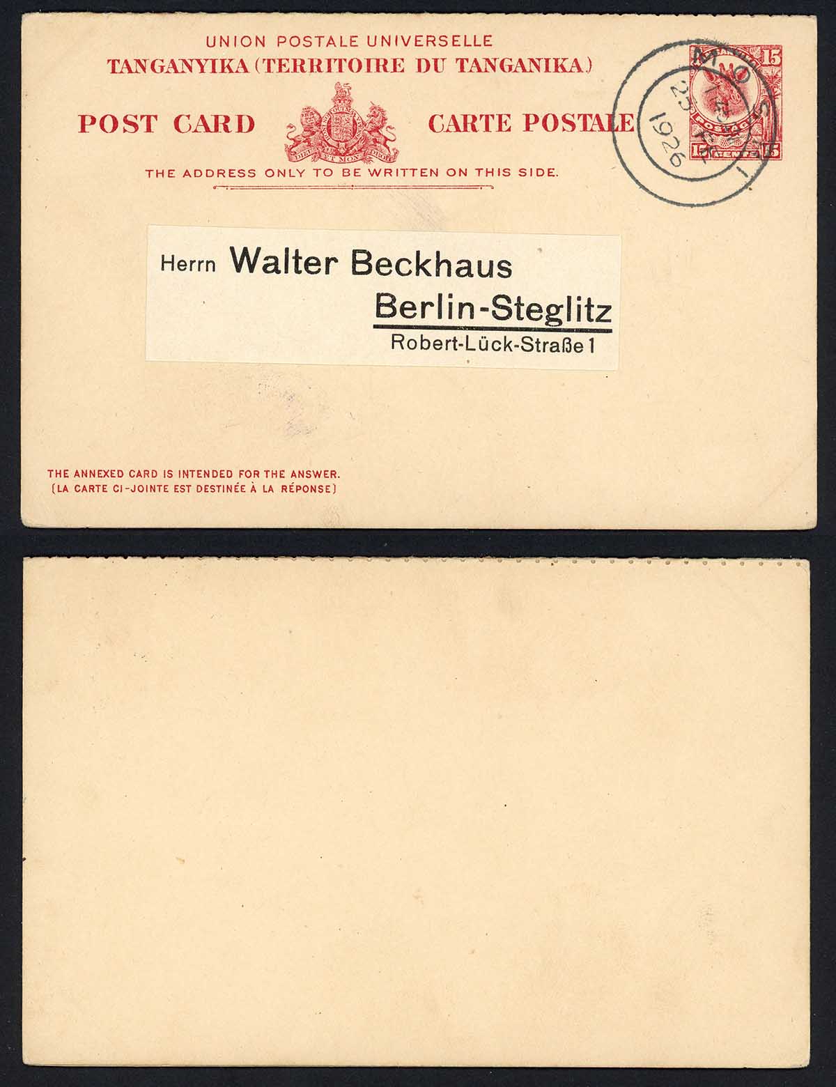 Tanganyika HG2 15c Reply card used to German (reply part intact) RARE