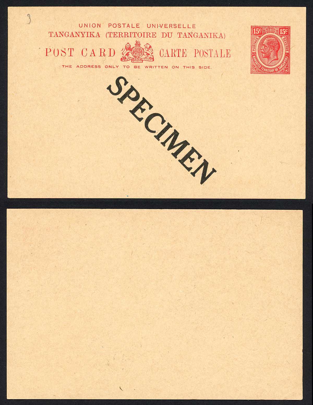 Tanganyika HG3 15c Post card opt Specimen
