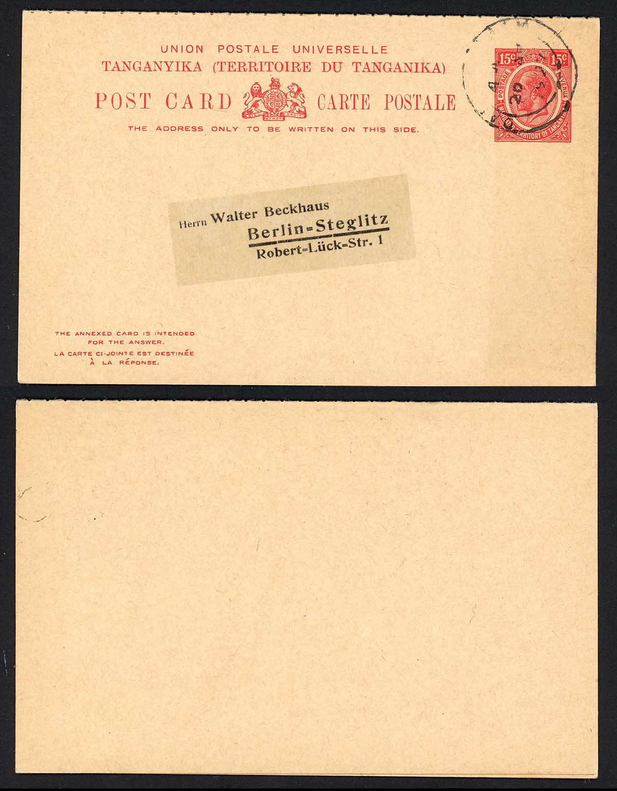 Tanganyika HG4 15c reply card used to Germany reply half still intact