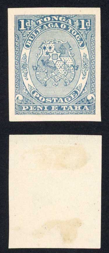 TONGA 1892 (PROOF) 1d ARMS of TONGA UNADOPTED DESIGN in Blue