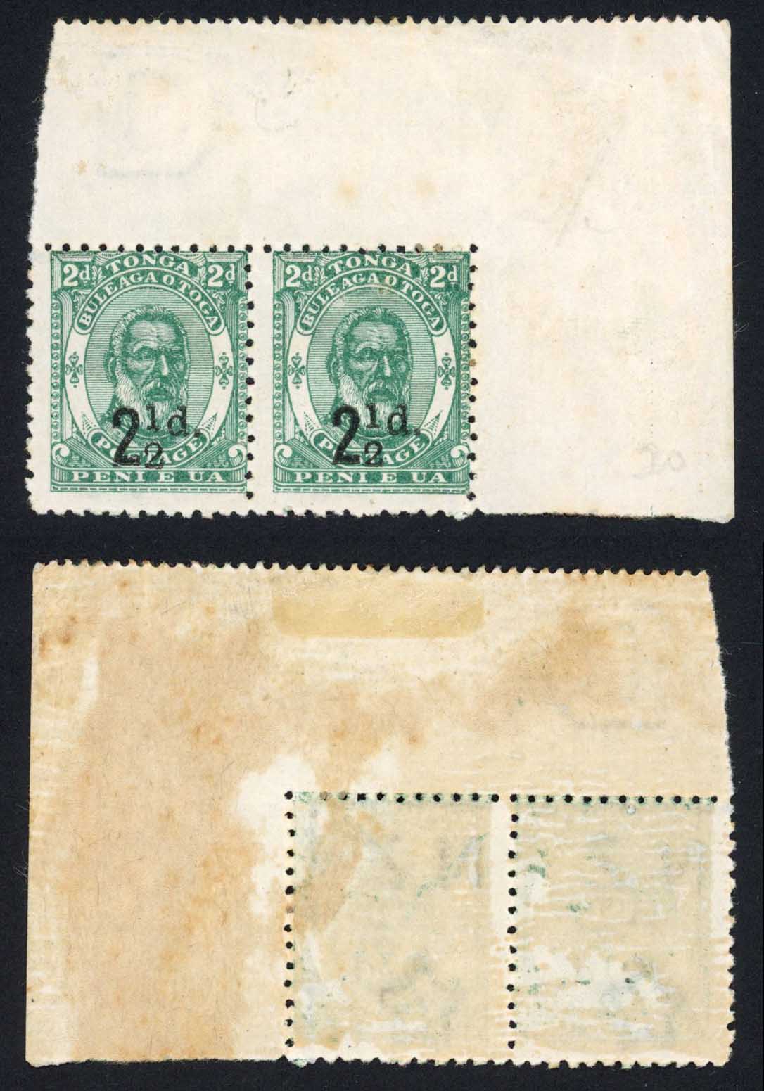Tonga SG20 2 1/2d on 2d in Black M/M Corner Pair Cat 50++ pounds