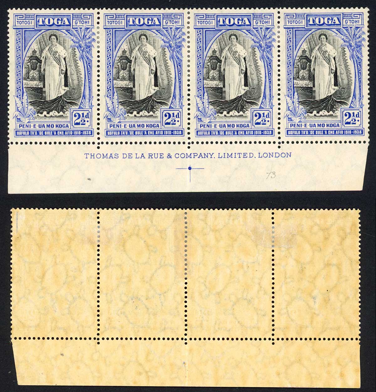 Tonga SG73 2 1/2d Imprint Strip (central perfs strengthened) Cat 88 pounds
