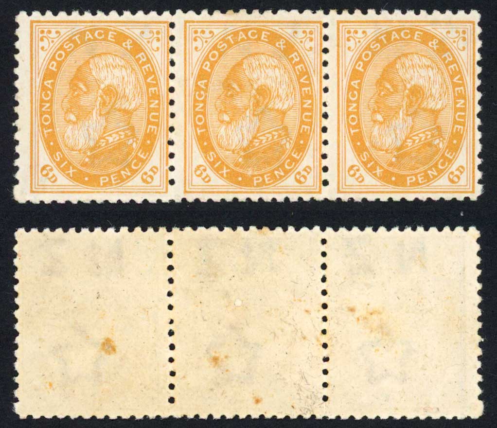 Tonga SG9 6d Yellow Orange M/M (odd rust spot) Fresh Strip Cat 75 pounds