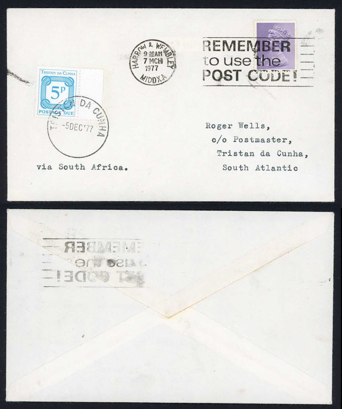 Tristan Da Cunha 1977 cover from the UK with 5p post due applied