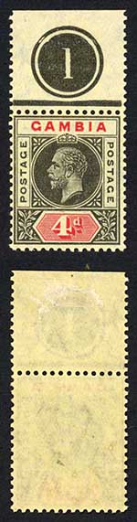 Gambia SG92b 4d Black and red/orange-buff Wmk Mult CA Plate Number Example U/M