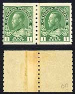 Canada SG219 1c yellow-green Imperf x perf 8 Coil join Pair M/M Cat 50 pounds