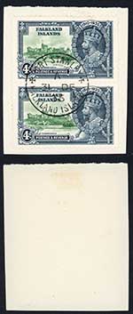 Falkland Is SG141 1935 4d Silver Jubilee CDS Pair on piece Cat 20 pounds