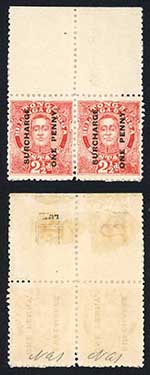 Tonga SG30 1d on 2 1/2d vermilion Mint (no gum) Cat 200 pounds