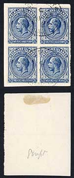 Jamaica SG72e 3d purple on yellow paper Damaged S and Large Stop Plate Block
