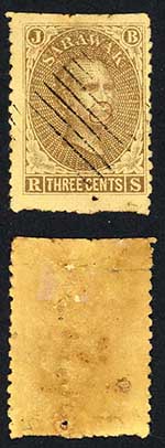 Sarawak SG1 3c Brown/yellow used with 9 Bar pmk Very Scarce Cat 250 pounds