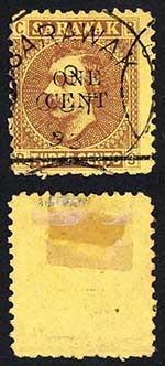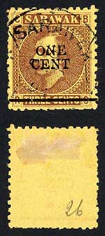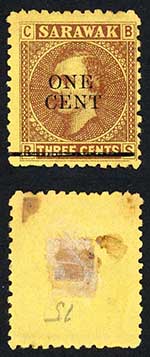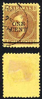 Sarawak SG27 1c on 3c Brown/yellow CDS used Cat 6 pounds