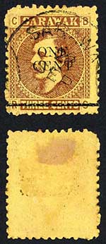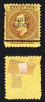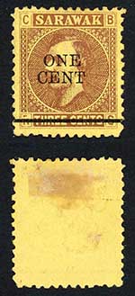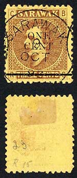 Sarawak SG27 1c on 3c Brown/yellow CDS used Cat 6 pounds