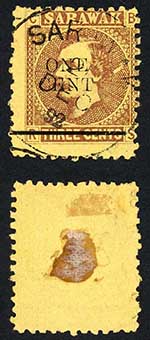 Sarawak SG27 1c on 3c Brown/yellow CDS used Cat 6 pounds