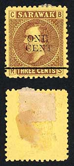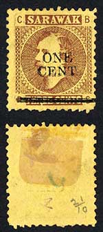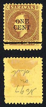 Sarawak SG27a 1c on 3c Brown/yellow Stop after Three Fine used Cat 65 pounds