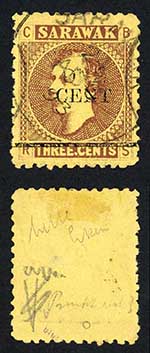 Sarawak SG27 1c on 3c Brown/yellow Double cancel Bar