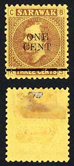 Sarawak SG27a 1c on 3c Brown/yellow Stop after Three Mint Cat 75 pounds