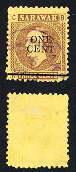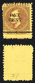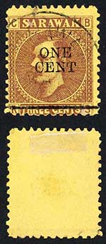 Sarawak SG27 1c on 3c Brown/yellow CDS used Cat 6 pounds