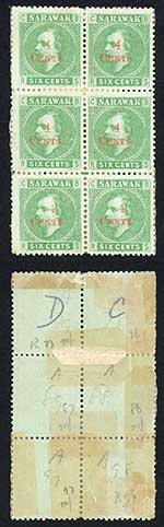 Sarawak SG34 4c on 6c Green Block of SIX Cat 390+++ pounds