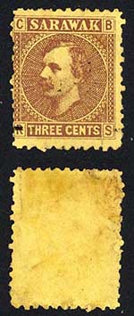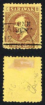 Sarawak SG27 1c on 3c Brown/yellow Overprint partially omitted