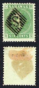 Sarawak SG5 1875 6c Green/green with S in Diamond cancel