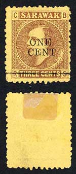 Sarawak SG27 1c on 3c Brown/yellow Overprint partially omitted