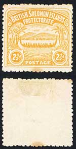 Solomon Is 2 1/2d Large Canoe Forgery Wrong Perf type (Paddle touching shore)