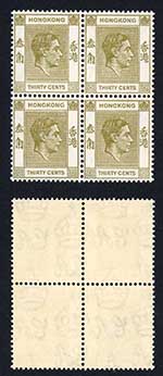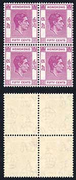 Hong Kong SG153a KGVI 50c Deep Magenta Perf 15 x 14 U/M Block Cat 120 pounds