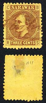 Sarawak SG4 1875 4c red-brown/yellow with S in Diamond cancel in VIOLET