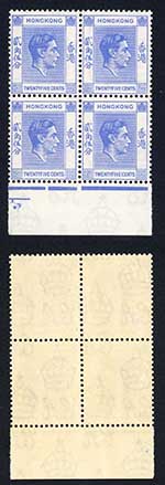 Hong Kong SG1491938-46 25c bright blue Superb U/M Block Cat 116+ pounds
