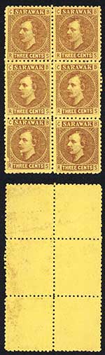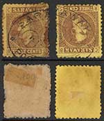 Sarawak SG2 3c Brown/yellow Sarawak Large Double Oval pmk over 2 stamps