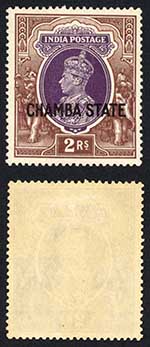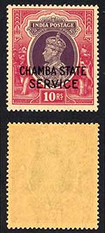 Chamba SG71 KGVI 10r Purple and Claret U/M (toned) Cat 90 pounds